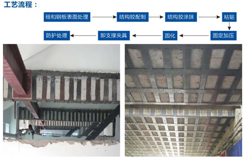 粘贴钢板加固/粘钢加固,是将钢板釆用高性能的环氧类粘结剂粘结于混凝土构件的表面;使钢板与混凝土形成统一的整体,利用钢板良好的抗拉强度达到增强构件承载能力及刚度的目的。